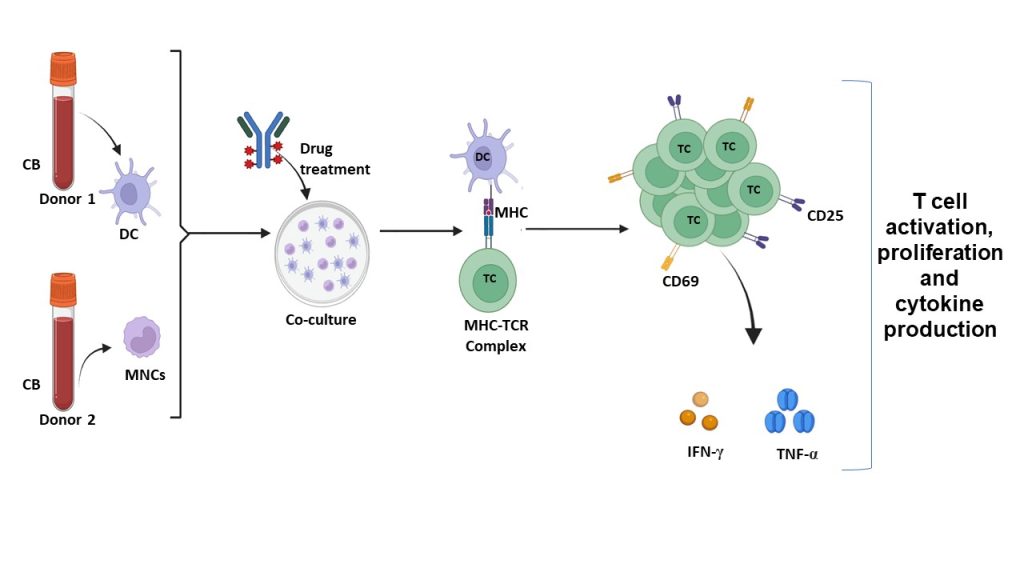 Schematic illustration of the one-way allogeneic mixed lymphocyte reaction (MLR) experimental workflow. Cord blood (CB) derived dendritic cells (DCs) from Donor 1 were co-cultured with mononuclear cells (MNCs) from Donor 2 and exposed to the test compound. Antigen presentation through the major histocompatibility complex (MHC)–T cell receptor (TCR) interaction resulted in T-cell activation. T-cell activation was assessed by surface expression of early (CD69) and late (CD25) activation markers using flow cytometry, along with functional readouts including T-cell proliferation and cytokine secretion. Pro-inflammatory cytokines, including IFN-γ and TNF-α, were quantified by ELISA.